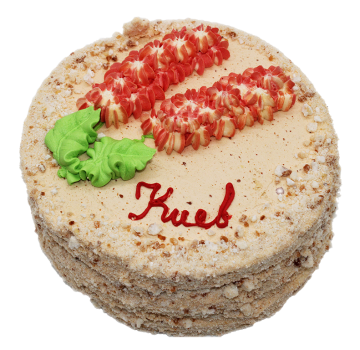 Getrocknetes Baiser mit Erdnüssen, geschichtet mit Creme aus gezuckerter Kondensmilch. Randdekor und bunten Blumen aus Baiser und Creme.