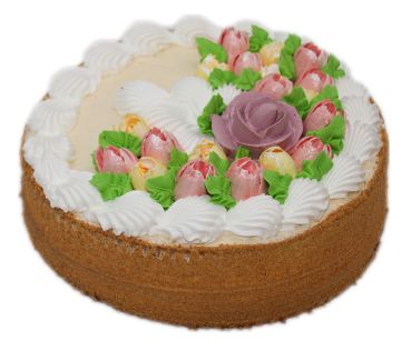 Zarter Biskuitboden, abgeschmeckt mit Sirup und Cremeschichten nach russischer Art. Randdekor und bunte Blumen aus Baiser und Creme.