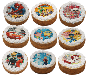 Zarter Biskuitboden, abgeschmeckt mit Sirup und Cremeschichten nach russischer Art. Randdekor und bunte Blumen aus Baiser und Creme, mit Bild aus essbarem Papier.
