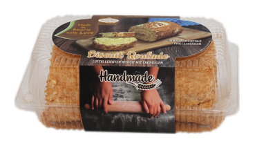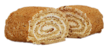 Zarte Biskuitrolle mit Cremeschichten aus Creme und Erdnüssen.