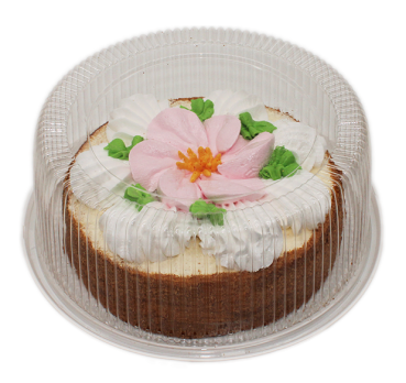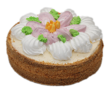 Zarter Biskuitboden, abgeschmeckt mit Sirup, aromatisierter Fruchtfüllung und Cremeschichten nach russischer Art. Randdekor und bunte Blumen aus Baiser und Creme.