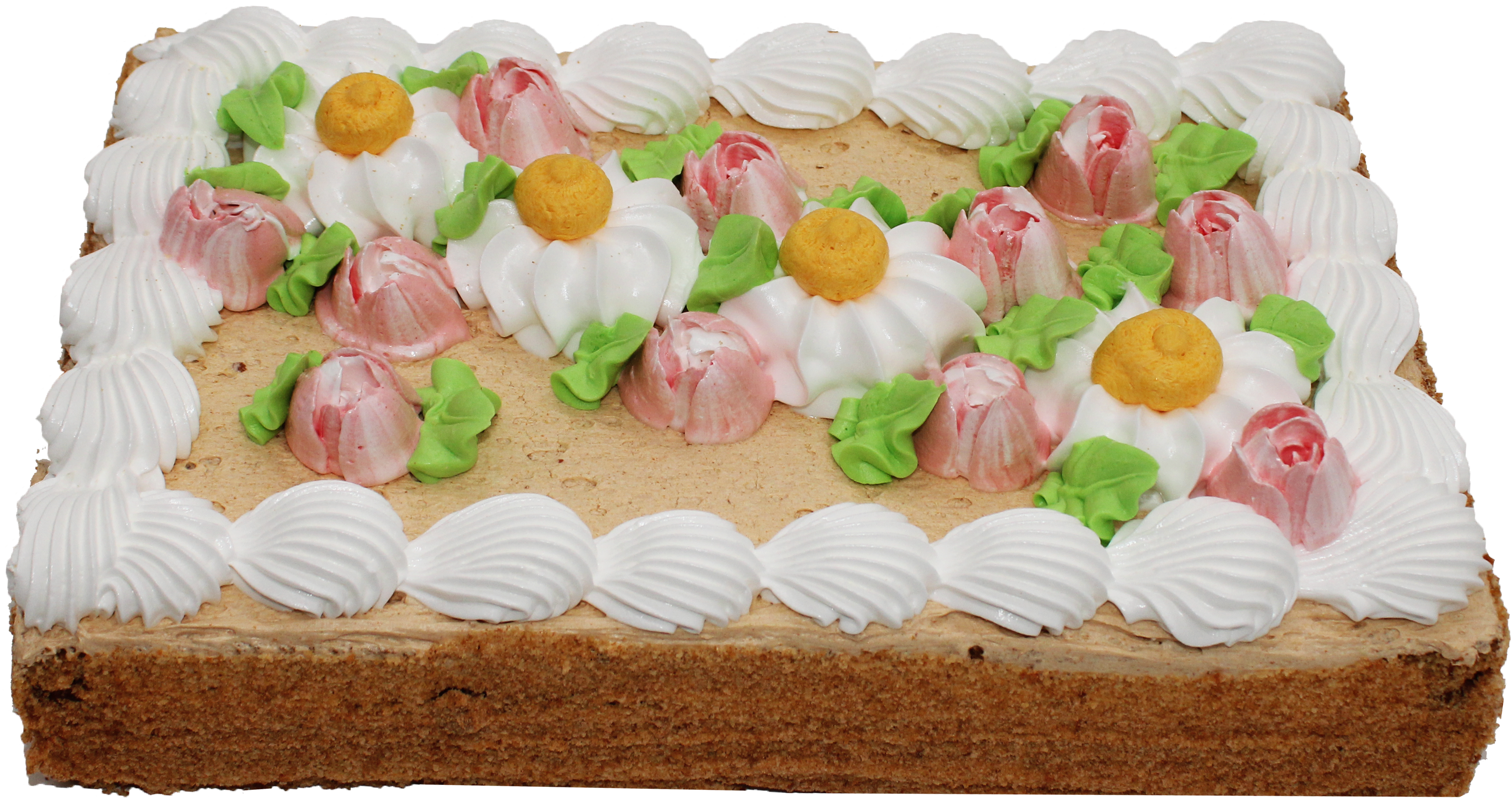 Rührkuchen mit Honig-Geschmack. Geschichtet mit Creme aus gezuckerter Kondensmilch und aromatisierter Fruchtfüllung. Dekoriert mit Baiser und Creme.